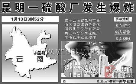 昨日凌晨3時50分許,昆明市西山區?阪傇铺旎瘒H化工股份有限公司三環分公司硫酸廠硫磺倉庫,在硫磺裝卸過程中,硫磺粉塵發生爆炸并起火燃燒。事故共造成5人死亡,32人受傷,兩人失蹤。