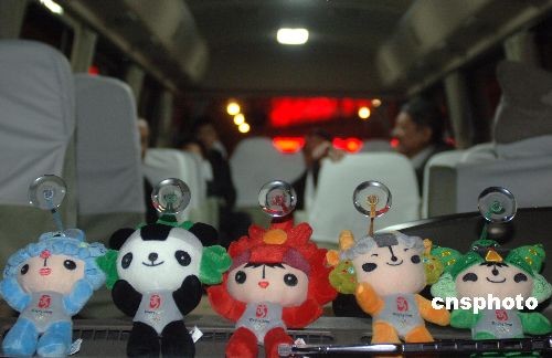 迎接的車輛上放置的奧運福娃。中新社發 廖攀 攝
