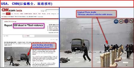 聲明中寫道:“一個叫‘’的網站和其他一些地方對于CNN在西藏事件上的報道點名批評。”對于中國網民對CNN將一張圖片中“藏獨”分子向卡車投擲石塊的畫面進行剪裁的不滿,CNN辯稱,“受到質疑的那幅照片被完全‘適當地’應用在了特定的編輯內容中”,并稱所展示的內容不會引起誤解。