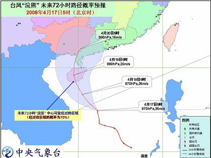 中新網4月17日電 中央氣象臺今天早晨六點鐘發布臺風橙色警報:今年第1號臺風浣熊(NEOGURI)的中心今天早晨5點鐘位于海南省三亞市東南方向大約480公里的南海中部海面上,就是北緯14.9度,東經112.3 度,中心附近最大風力有12級(35米/秒)。