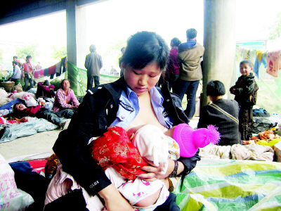 資料圖:蔣曉娟一手一個(gè)為災(zāi)區(qū)嬰兒哺乳。
