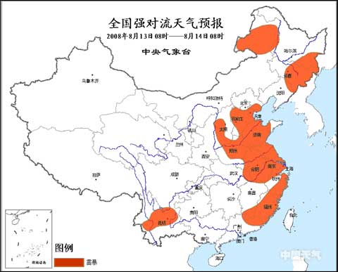 中新網8月13日電 據中國天氣網消息,中央氣象臺今晨六時繼續發布強對流天氣預報: