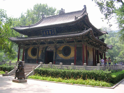 在中軸線末端,是宏偉壯麗的圣母殿。圣母殿背靠懸甕山,前臨魚沼,晉水的其他二泉——“難老”和“善利”分列左右。此殿創建于北宋天圣年間(公元1023——1032年),崇寧元年(公元1102年)重修,是現在晉祠內最為古老的建筑。殿高約十九米,重檐歇山頂,面寬七間,進深六間,平面布置幾乎成方形。殿身四周圍廊,前廊進深兩間,廊下寬敞。在我國古代建筑中,殿周圍廊,此為現存最早的一個實例。殿周柱子略向內傾,四根角柱顯著升高,使殿前檐曲線弧度很大。下翹的殿角與飛梁下折的兩翼相互映襯,一起一伏,一張一弛,更顯示出飛梁的巧妙和大殿的開闊。殿、橋、泉亭和魚沼,相互陪村,渾然一體。圣母殿采用“減柱法”營造,殿內外共減十六根柱子,以廊柱和檐柱承托殿頂屋架,因此,殿前廊和殿內十分的寬敞。“減柱法”的熟練使用。說明宋代在建筑上已進一步掌握了力學原理;斗拱和柱高的比例適當,避免了隋唐建筑中用料的浪費,在建筑式樣上也更富于藝術性。我國的木結構建筑,經歷了一個由隋唐的雄壯堅實到明清的華麗輕巧的發展地程,而宋代建筑正是這個過程中的重要環節。圣母殿是宋代建筑的代表作,對于研究我國宋代建筑和我國建筑發展史都很有價值。殿內無柱,不但增加了高大神龕中圣母的威嚴,而且為設置塑像提供了很好的條件。殿內共四十三尊泥塑彩繪人像,除龕內二小像系后補外,其余多北宋代原塑。主像圣母,即唐叔虞和周成王的母親,周武王的妻子,姜子牙的女兒——邑姜,其塑像設在大殿正中的神龕內。其余四十二尊侍從像對稱地分列于龕外兩側。其中宦官像五尊,著男服的女官像四尊,侍女像共三十三尊。圣母邑姜,曲膝盤坐在飾鳳頭的木靠椅上,鳳冠蟒袍,霞帔珠瓔,面目端莊,顯示了統治者的尊貴和奢華。四十二個侍從像,手中各有所奉,為帝后服種種勞役,例如侍奉文印翰墨,灑掃梳妝,奉飲食,侍起居以至奏樂歌舞等等。這些塑像造型生動,姿態自然,尤其是侍女像更是精品。宋代的藝人,滿懷同情,塑造了一群終生被幽禁深宮,失去了自由,埋葬了青春的女性。這些侍女像的肢體身材比較造度,服飾美觀大方,衣紋明快流暢。她們的年齡或任或少,身段或豐滿或苗條,面龐或圓潤或清秀,神態或幽怨或天真,一個個性格鮮明,表情自然,加之高度與真人相仿,更顯得栩栩如生。這組塑像突破了神廟建筑中以塑造神佛為主的老套,真實地表現了被禁錮深宮受盡役使的侍從們的生活精神面貌,從而反映了封建社會中的一個側面。在技巧上,顯然相當準確地掌握了人體的比例和解剖關系,手法純熟,有高度的藝術表現力。它們是我國古代雕塑藝術中的珍品,在美術史上占有重要的位位。人們談到晉祠,往往總要談到這些精彩的宋塑。