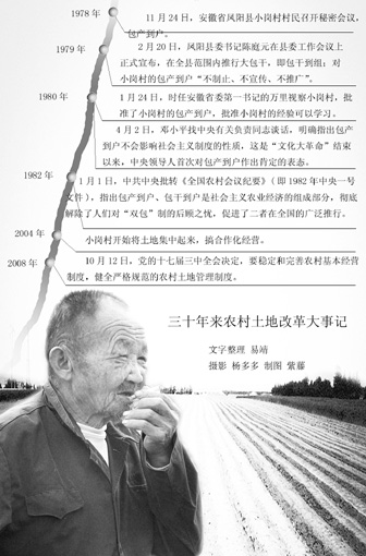 30年前的1978年11月24日,即為中共十一屆三中全會做準備的中央工作會議閉幕的前一天,小崗生產隊的18家農戶,聚集在冬日寒風中的一間破舊茅舍里,昏暗的燈光下,18人用粗糙的手指在一份事先準備好的“包干到戶保證書”上按下了堅實的手印,為此真正拉開了農村“包產到戶”責任制的序幕。