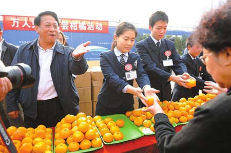 昨日(2日)上午,農(nóng)業(yè)部副部長(zhǎng)陳曉華、副省長(zhǎng)張作哈、省農(nóng)業(yè)廳廳長(zhǎng)任永昌來到成都春熙路街頭廣場(chǎng),帶頭吃下蜜柑,以此消除人們品嘗柑橘的顧慮。昨日由省農(nóng)業(yè)廳、成都市農(nóng)委、成都市商務(wù)局共同主辦的“萬人免費(fèi)品嘗柑橘活動(dòng)”在全市各大超市舉行。全省各柑橘主產(chǎn)地也同時(shí)開展了免費(fèi)品嘗活動(dòng)。