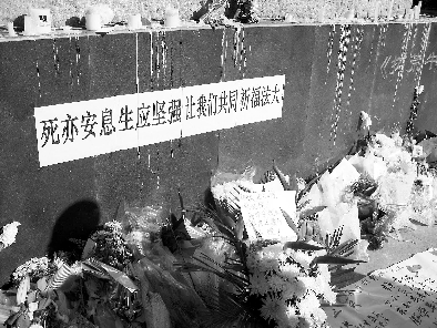 “死亦安息生應堅強讓我們共同祈福法大”。10月31日中午,中國政法大學昌平校區拓荒牛雕塑的基座上,一條白底黑字的條幅在陽光下冷冷地注視著過往的每一個人。雕塑前的地面上,幾排黃色的、白色的菊花在秋風中靜靜綻放。