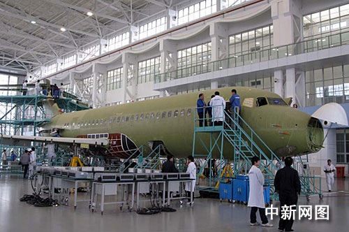 中國商飛上海飛機制造廠ARJ21總裝生產線,科研人員正在總裝ARJ21-700新支線飛機。