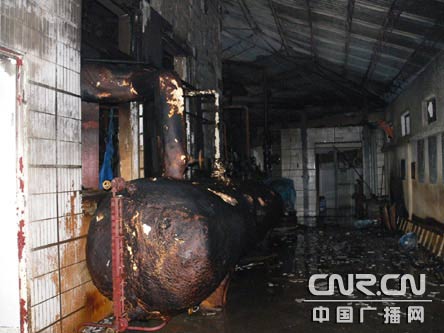 火災過后,車間內一片狼籍,部分氨氣管道外已結冰,在車間,技術人員經過檢查,發現的連接氨氣的電機制冷機一個蓋子“爆了”,技術人員稱爆炸就是從這里產生的。
