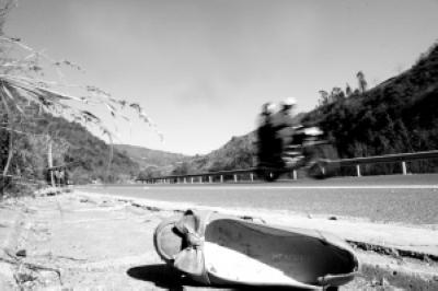 車禍發(fā)生的路段是沒有隔離欄的雙向兩車道路面,去年剛剛通車的路面情況較好。發(fā)生車禍的地方,只是一個不太急的彎道。雖然車禍已經(jīng)過去了10天,但通過車禍現(xiàn)場周圍散落的摩托車碎片、死者的衣物、血跡,仍讓人感覺到車禍發(fā)生時的慘烈情景。