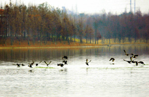海灣國家森林公園位于奉賢區五四農場境內,目前一期工程已完成90%,建成后將是上海規模最大的森林公園,預計年內可試開放。公園擁有大面積接近自然生態的森林和上海最大的人工湖泊——百鳥湖。園內種植了350多種400多萬棵樹木。圖為上午百鳥湖上野鴨飛舞 本報記者 紀海鷹 通訊員 周沅生 攝影報道