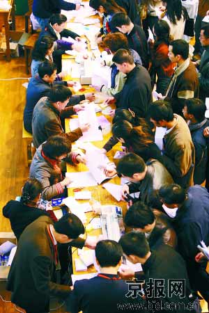 今天上午,節后首場綜合招聘會在(北京)農展館舉行,人潮涌動的熱烈場面再次凸顯了2009年嚴峻的就業形勢。再過幾天,北京市及中央國家機關公務員招考也將陸續進入面試階段。