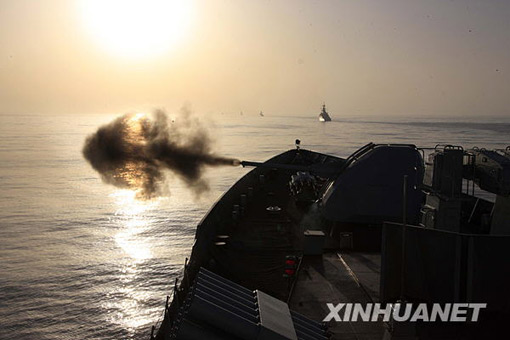 17時(shí)45分,海上實(shí)彈射擊浮體靶演練開始。17時(shí)58分,在急促的戰(zhàn)斗警報(bào)聲中,“廣州”艦實(shí)施主炮射擊。隨著一聲驚雷般巨響,該艦“海外第一炮”首發(fā)命中,擊沉3.5海里外的浮體靶,完成了“廣州”艦此行最主要的演習(xí)課目——海上實(shí)彈射擊,實(shí)現(xiàn)了既定目標(biāo)。在場觀摩的巴基斯坦和澳大利亞海軍觀察員當(dāng)即向中國海軍官兵豎起了大拇指。組織該課目演練的指揮艦——英國皇家海軍“波特蘭”號指揮官專門給“廣州”艦發(fā)來賀電,稱贊中國海軍“干得好”。指揮員陳岳琪說:“這是我們所希望的,也是我們努力的結(jié)果。參演官兵為國家、為海軍爭了光!”
