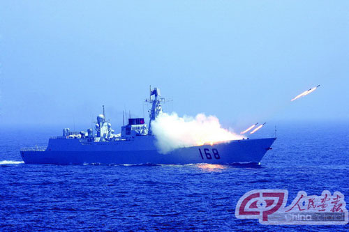 中國海軍新型導彈驅逐艦在演習中發射反潛深水火箭彈。