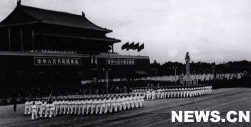 保衛(wèi)著祖國領海的水兵們,通過廣場后,百倍警惕地保衛(wèi)著社會主義建設的中國人民解放軍公安軍繼續(xù)行進。