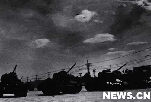 接著,受閱部隊開始分列式。軍事學(xué)院的隊伍邁開整齊的步伐首先走進天安門廣場。緊跟在他們后面的是步兵學(xué)校、炮兵學(xué)校、工程兵學(xué)校、坦克學(xué)校、航空學(xué)校、海軍學(xué)校和水兵、公安軍、步兵、摩托化步兵、傘兵的隊伍。隨后,裝備著各種大口徑遠射程大炮的炮兵部隊和威力強大的坦克部隊相繼通過了廣場。當(dāng)坦克部隊在天安門廣場出現(xiàn)時,一隊隊噴氣式轟炸機和殲擊機風(fēng)馳電掣地飛過天安門上空。