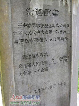 采訪中,記者聯(lián)系遵譚鎮(zhèn)委核實王安春的身份。遵譚鎮(zhèn)委辦公室的負責(zé)人告訴記者,王安春確實在澄邁永發(fā)鎮(zhèn)當(dāng)過鎮(zhèn)長,后來還在該縣農(nóng)業(yè)局就任副局長,在儒友村修造的活人墓,正是王安春所為。