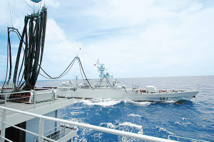 海面上波滾浪涌。一陣急促的鈴聲響過,演練指揮員、某作戰支援艦支隊支隊長王永祥果斷下達命令,航行中三向補給正式開始。隨著撇纜槍兩聲脆響,細細的纜繩從“青海湖”號大型綜合補給艦左、右兩側飛躍至“蘭州”艦、“昆侖山”艦甲板。處于縱向補給陣位的“巢湖”艦也撈起浮標軟管,開始油料補給,長長的管道宛如一條長龍在波濤中起伏。