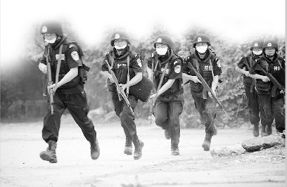 經(jīng)過1小時的現(xiàn)場處置,當(dāng)?shù)鼐綄ⅰ翱植婪肿印眹?yán)密封控在工廠一區(qū)域內(nèi)。但“恐怖分子”沒有絲毫棄械投降的意思,仍舊挾持人質(zhì)與警方對峙,并威脅炸毀化工設(shè)施。此時,接到報(bào)警的河北省反恐指揮中心迅速啟動省級反恐預(yù)案,成立省級反恐指揮部,并派省級公安特警、武警、消防、衛(wèi)生、氣象和環(huán)保力量,迅速趕往涿州現(xiàn)場增援處置。與此同時,國家也緊急調(diào)派國家反恐應(yīng)急處置力量——— 武警“雪豹突擊隊(duì)”和解放軍“三防醫(yī)學(xué)救援隊(duì)”前往現(xiàn)場增援。