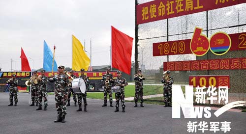 進(jìn)駐閱兵村后,為豐富官兵文化生活需要,方隊(duì)緊急組建了這支小型軍樂(lè)隊(duì),配備了大小號(hào)、長(zhǎng)圓號(hào)、大小軍鼓等各種管弦和打擊樂(lè)器。雖然樂(lè)隊(duì)成員只有10人,卻個(gè)個(gè)藝精才高。他們有的畢業(yè)于藝術(shù)學(xué)校,民樂(lè)、西洋管樂(lè)樣樣皆通;有的來(lái)自嗩吶世家,"童子功"相當(dāng)深厚;還有的是國(guó)家一級(jí)演員的弟子,快板說(shuō)得頭頭是道……個(gè)個(gè)都是方隊(duì)的文藝骨干。這支軍樂(lè)隊(duì)也成了方隊(duì)的文藝演出小分隊(duì)。