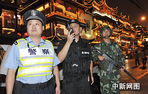 圖為上海市公安局黃浦分局夜間聯合武裝巡邏隊在老城廂豫園地區巡邏。陳揚 攝