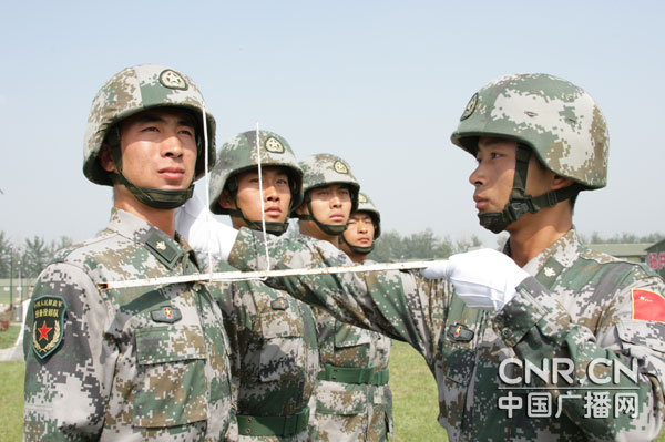 “向右擺頭45度,帽檐前緣與眉同高。”“兩腳分開60度,向前踢腿時,腳掌距離地面60厘米!薄跋蛴铱吹降卓词裁吹胤健边@組看起來枯燥乏味的數字 、簡單易學的動作,卻并不容易精確掌握做到,并直接影響著閱兵訓練的全局(方隊的整齊一致)。