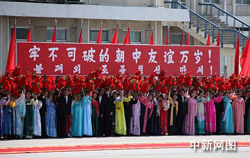 溫家寶一行乘車前往平壤市區(qū)途中,數(shù)十萬平壤市民身著節(jié)日盛裝,揮舞中朝兩國國旗、花束和標語,高呼中朝友好口號,夾道歡迎。溫家寶在金英日陪同下,站在敞篷汽車上向歡迎群眾揮手致意,并多次下車,與他們握手。車隊途經平壤凱旋門時,朝鮮少先隊員向溫家寶敬獻鮮花,并給溫家寶系上紅領巾。