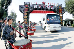 上午9時整,北京某預備役師的官兵載譽離村,擊鼓歡送