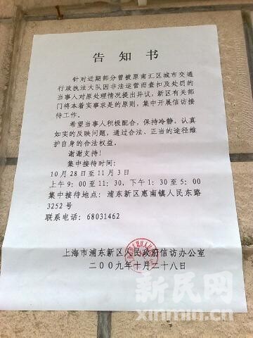 上海新民網今日透露以上信息。據報道,一份28日由上海市浦東新區人民政府信訪辦公室出具的告知書稱:“針對近期部分曾被原南匯區城市交通行政執法大隊因非法運營而查扣及處罰的當事人對原處理情況提出異議,新區有關部門將本著實事求是的原則,集中開展信訪接待工作。”