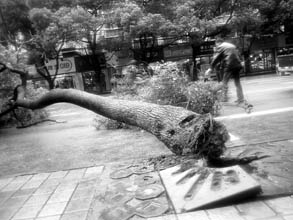 隨后,這棵樹迎風墜地,樹根被連根拔起,發出巨大的砰響聲,周邊的地磚也被鑿裂。當記者趕至現場時看到,這棵大樟樹直徑約有20公分,高約5米。