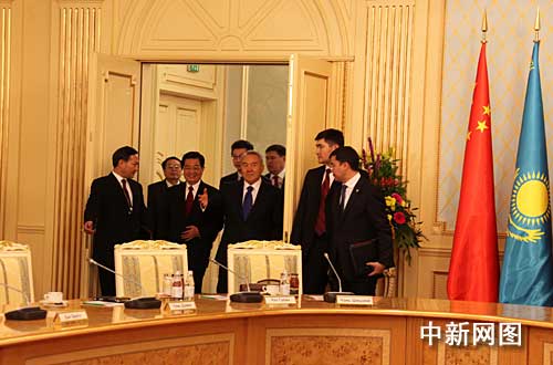 會談前,胡錦濤和納扎爾巴耶夫共同出席中哈天然氣管道竣工儀式。會談后,兩國元首在總統府內見證了雙方合作文件的簽署,并共同會見記者。