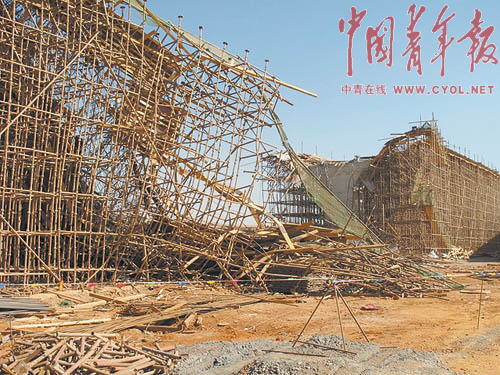 1月4日,記者在工地現場看到,垮塌的支架觸目驚心,無數的鋼筋斷裂交錯,長長的引橋被撕裂成一個很大的口。