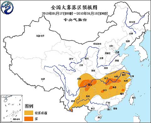 中央氣象臺2010年1月17日06時發布大霧藍色預警: