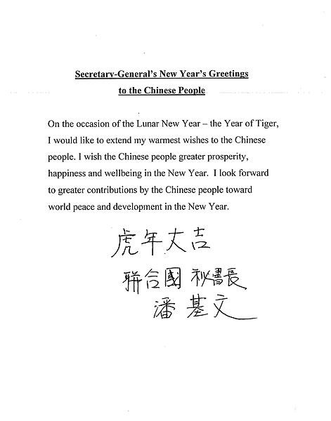 潘基文在用英文發(fā)表的賀詞中說(shuō):“值此農(nóng)歷新年‘虎年’到來(lái)之際,我謹(jǐn)向中國(guó)人民致以最熱烈的祝賀。祝愿中國(guó)人民在新的一年里更加幸福安康。我期待著中國(guó)人民在新的一年里為世界和平與發(fā)展作出更大貢獻(xiàn)。”