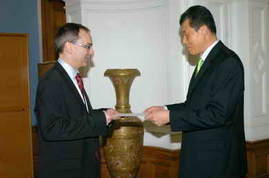 中新網3月3日電 據外交部網站消息,2010年3月1日,中國駐英國大使劉曉明向英國外交部禮賓司司長兼外交使團副典禮官馬丁遞交國書副本。