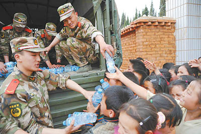 每桶水都有八九十斤重,剛搬了幾桶全身就濕透了,好多戰友都脫下衣服干活兒。太陽很毒,每天我們都要暴曬十來個小時,加上塑料桶的摩擦,大家的身上不是被曬暴皮,就是被桶磨破了。這幾天不時還要出去撲救山火。這樣一來,暴皮的地方出現了不少水泡,稍碰一下就特別疼。有的戰友一狠心,干脆把水泡扎破了。