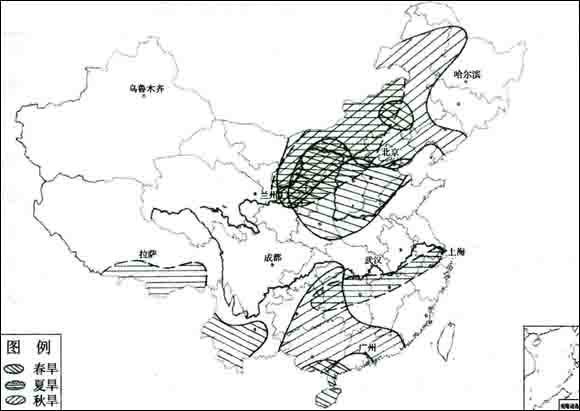 2005年我國降水總量較常年稍偏多,其中西北西部、青藏高原北部、黃淮南部偏多3成至1倍,南疆部分地區(qū)偏多1倍以上,而寧夏、內(nèi)蒙古、北京、貴州等部分地區(qū)偏少1~3成,全國其余地區(qū)降水量則接近常年。年內(nèi),降水分布比較均勻,沒有出現(xiàn)大范圍、持續(xù)時(shí)間長的嚴(yán)重干旱,旱情較常年輕;但華南南部出現(xiàn)嚴(yán)重的秋冬春連旱,云南發(fā)生近50年來少見的嚴(yán)重春旱,西北東部以及內(nèi)蒙古等地發(fā)生夏秋連旱,江南西部、華南一度秋旱明顯。全年受旱面積較大或旱情較重的有內(nèi)蒙古、寧夏、山西、陜西、廣東、廣西、海南等省(區(qū))。2005年旱區(qū)分布如圖所示。總體看來,全國嚴(yán)重持續(xù)性干旱范圍較小,損失偏輕,受災(zāi)面積遠(yuǎn)低于20世紀(jì)90年代以來平均水平。