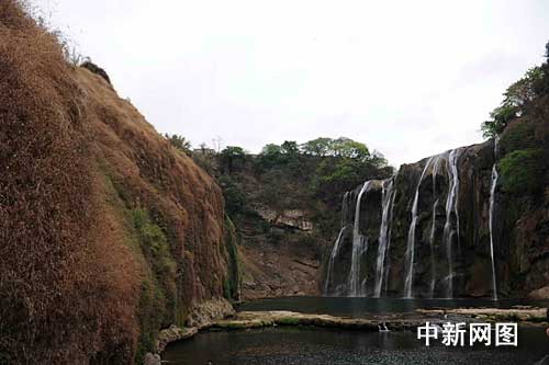進(jìn)入景區(qū),看見一小潭碧水緩流,走過兩座索橋,便見到了聞名遐邇的黃果樹瀑布,遠(yuǎn)遠(yuǎn)望去,十幾股細(xì)流從崖上留下,在懸壁裸露嶙峋的石間撞擊穿梭,形成小小的瀑面,卻全然擋不住崖壁的黑青色,與往日“萬里水匯一水大,訇訇聲聞十里外”的景色相去甚遠(yuǎn)。而在瀑布左岸,一壁的昏黃枯草更顯得觸目驚心。