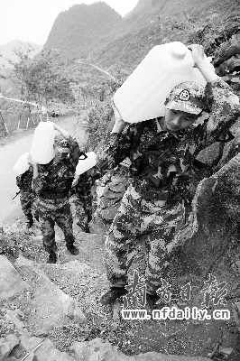 告別巖門屯許大媽家時(shí),已是中午1時(shí)多,官兵們顧不上吃午飯,拎著空桶又急匆匆向山下走去,他們要在就近的山澗采集清泉,為給下一個(gè)村的老百姓送水爭取時(shí)間……(南方日?qǐng)?bào)特派記者洪奕宜 通訊員李三紅 發(fā)自廣西百色)