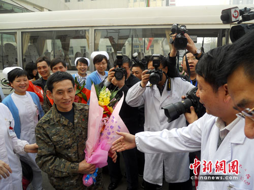 中新社太原4月16日電 題: 53名王家?guī)X獲救礦工出院 與山西醫(yī)護(hù)人員惜別