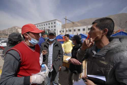 他的名字叫高樹友。在現(xiàn)場負(fù)責(zé)招募志愿者的玉樹團(tuán)州委干事扎西告訴我,地震發(fā)生后幾小時(shí),滿身是土的高樹友跑來了,找到我們要求當(dāng)志愿者。“當(dāng)時(shí)現(xiàn)場還很亂,我們隨便找了一張紙,高樹友寫下了第一個(gè)名字”,扎西從桌上拿出一個(gè)寫滿名字的紙說:“就是這樣的紙,現(xiàn)在已經(jīng)寫滿幾十頁,有400多人報(bào)名了,地震當(dāng)天有30多個(gè)。高樹友不僅是第一個(gè)報(bào)名,而且?guī)椭覀兘M織志愿者,這個(gè)招募點(diǎn)就是我們一起搭起來的。”