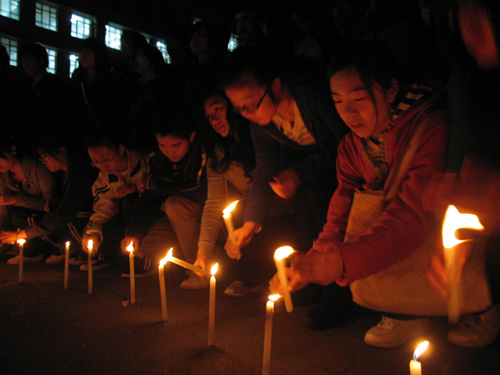中新網烏魯木齊4月22日電(冀江彤)21號晚間10時,新疆大學近3000名學子,點燃燭光,俯首致哀,表達對玉樹地震遇難者的哀思。活動結束后,仍有許多學生手捧燭光,不愿離去,為玉樹人民祈福加油。