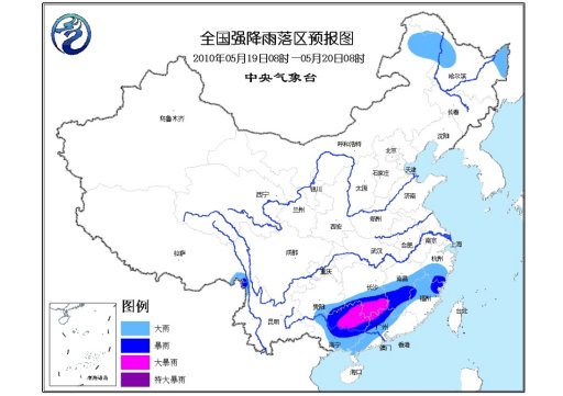 中新網5月19日電 中央氣象臺5月19日06時繼續發布暴雨藍色預警:預計,19日08時到20日08時,貴州東南部、湖南南部、江西中南部、浙江南部、福建中北部、廣西中東部、廣東北部和西部以及西藏東南部、云南西北部等地有大雨或暴雨。其中,廣西東北部、湖南南部、廣東西北部等地局部有大暴雨;內蒙古東北部、黑龍江東北部和西部的部分地區有大雨。