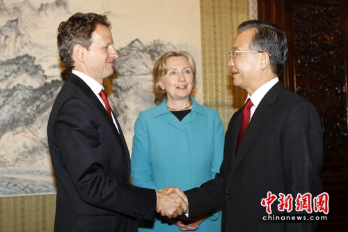 中新網北京5月25日電 (記者 張朔)中國總理溫家寶25日下午在中南海紫光閣會見來華出席第二輪中美戰(zhàn)略與經濟對話的美國國務卿克林頓和財長蓋特納。
