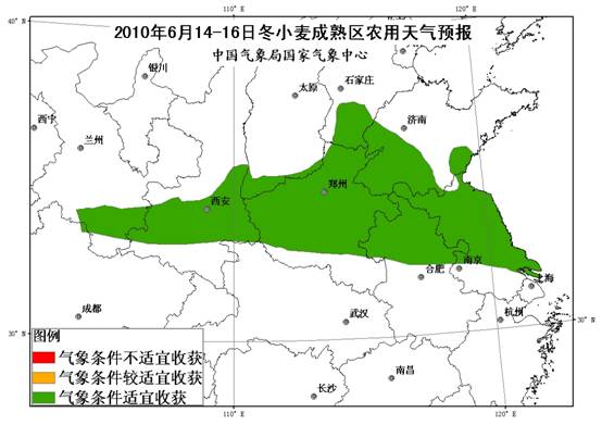 中央氣象臺預計,6月14-16日,陜西南部和關中、山西西南部、河北南部、河南中北部、山東西部和南部、安徽中北部和江蘇麥收區以晴到多云天氣為主,適宜冬小麥收獲晾曬和夏播作物播種。