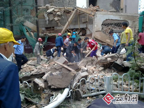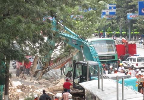 記者現場了解到,今天上午11時15分左右,云南飯店在拆遷過程中突然發生倒塌。靠東風西路一邊正在被拆遷的一堵高大約7米的墻體砸向公交站臺,一輛5路公交車正在站臺上下客,由于墻體離公交站臺非常近,正在下車的兩名乘客(一男一女)被砸傷。隨后,救護車迅速趕往現場,目前,兩名傷者均已被送往醫院搶救,傷勢尚不清楚。