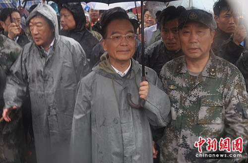 在羅針鎮,溫家寶冒雨在羅針鎮高速公路的羅針收費站下車,直接到了險情的岸邊,慰問現場搶險的人員。他和搶險的武警官兵親切握手,并即興發表了講話。