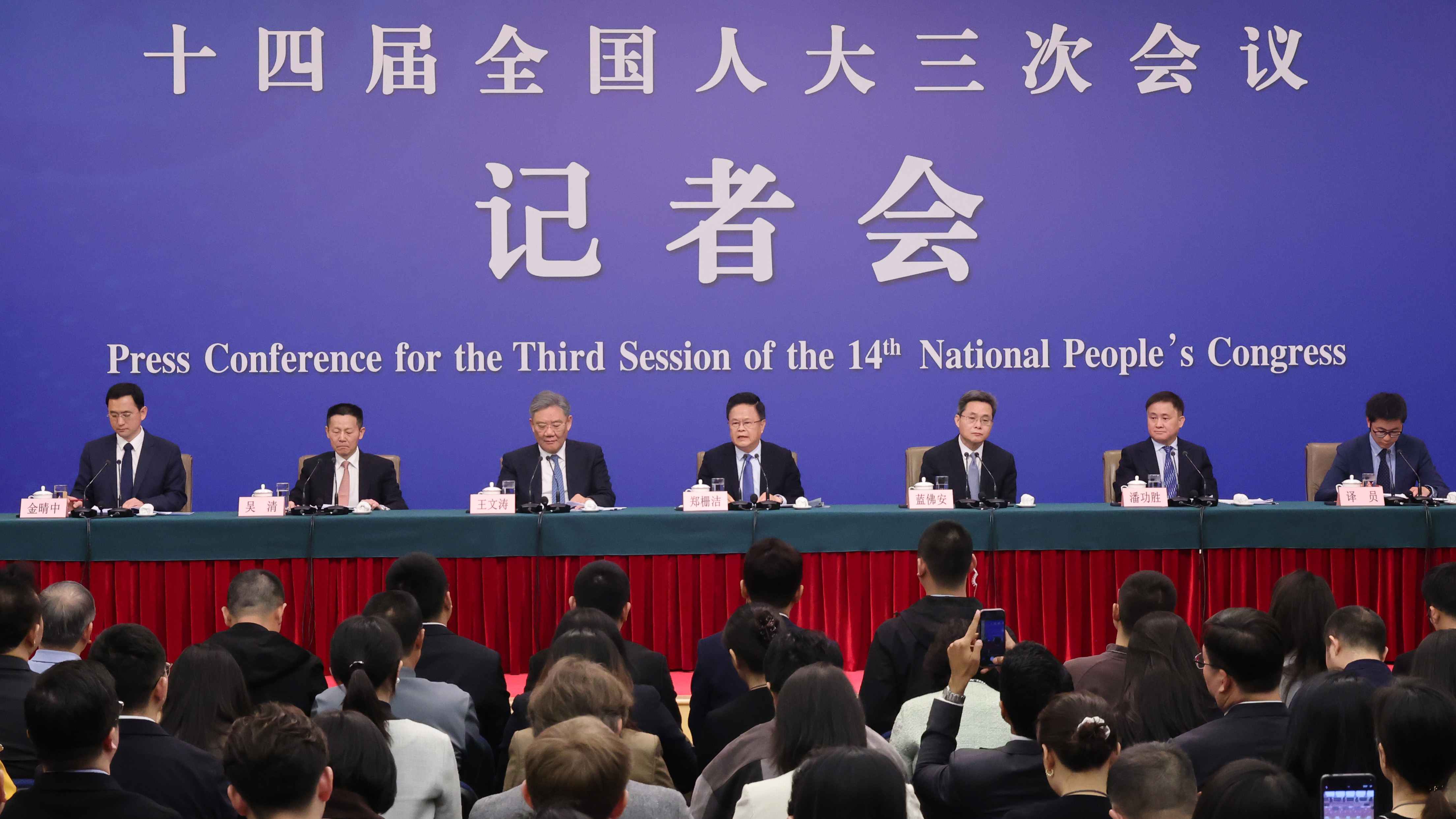 十四屆全國人大三次會議于3月6日(星期四)下午3時,在梅地亞中心新聞發布廳舉行記者會,邀請國家發展和改革委員會主任鄭柵潔、財政部部長藍佛安、商務部部長王文濤、中國人民銀行行長潘功勝、中國證券監督管理委員會主席吳清就發展改革、財政預算、商務、金融證券等相關問題回答中外記者提問。