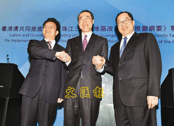 粵港澳三地政府19日在香港舉行共同推進實施《珠江三角洲地區(qū)改革發(fā)展規(guī)劃綱要》聯(lián)絡(luò)協(xié)調(diào)會議,唐英年、廣東省副省長萬慶良、澳門特區(qū)經(jīng)濟財政司司長譚伯源率領(lǐng)三方官員,就如何落實《綱要》中有關(guān)粵港澳合作的部分,進行深入討論。中聯(lián)辦副主任郭莉也出席會議。