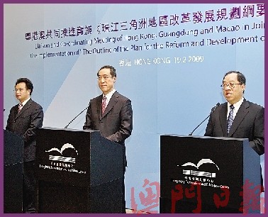 中新網2月20日電 《澳門日報》今日在頭條刊發報道稱,“粵港澳共同推進實施《珠江三角洲地區改革發展規劃綱要》聯絡協調會議”19日在香港舉行,粵港澳三地就四個重點工作達成共識。
