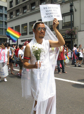 很多亞裔同志勇敢展示自己,其中不乏華裔身影。一位身穿結婚禮服的亞裔男同志,手舉“要求紐約承認同性婚姻”的牌子,表達了同志們的呼聲。也有不少同志的支持者參加游行,梁淑儀支持身為女同志的姐姐梁淑安一起來游行,當義工的劉健行和劉素夫婦表示有很多同志朋友,大家都是一樣的人,沒有什么不同。(劉爽)